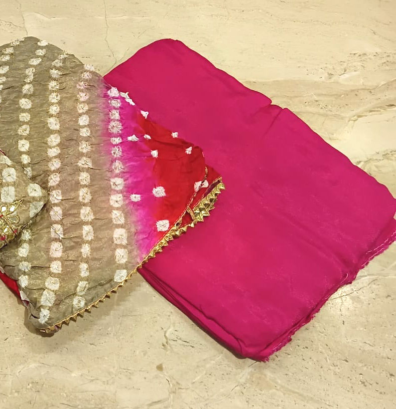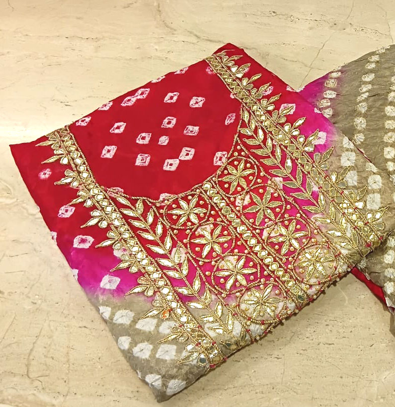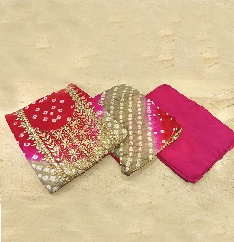 Art Silk Gotta Patti Bandhni Suit Double Shade Red And Rani
