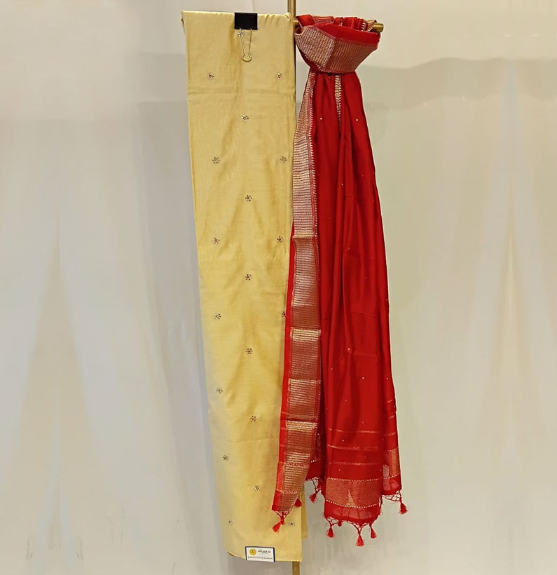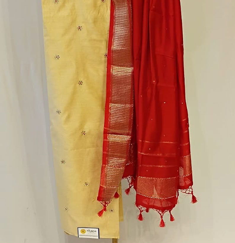 Assam Silk Zari Booti Suit Off White/ Red