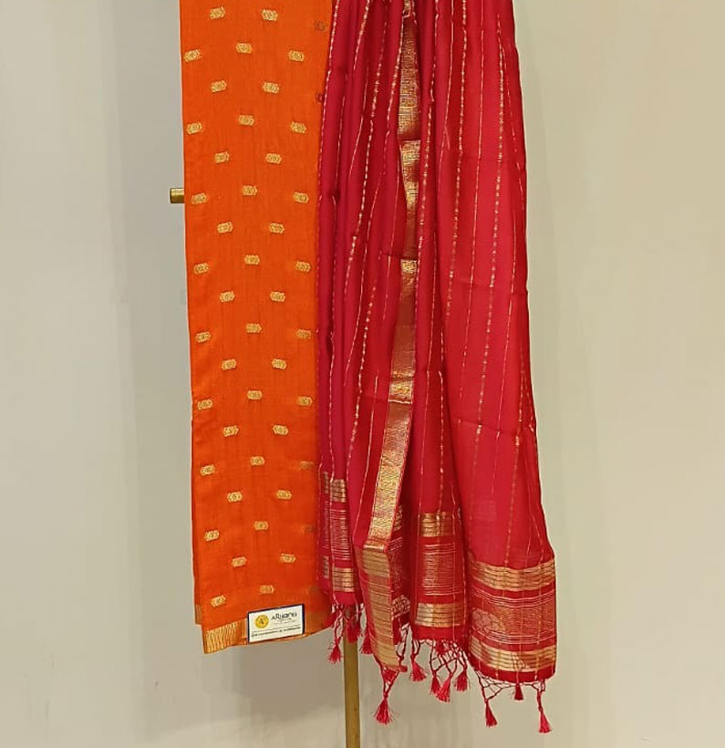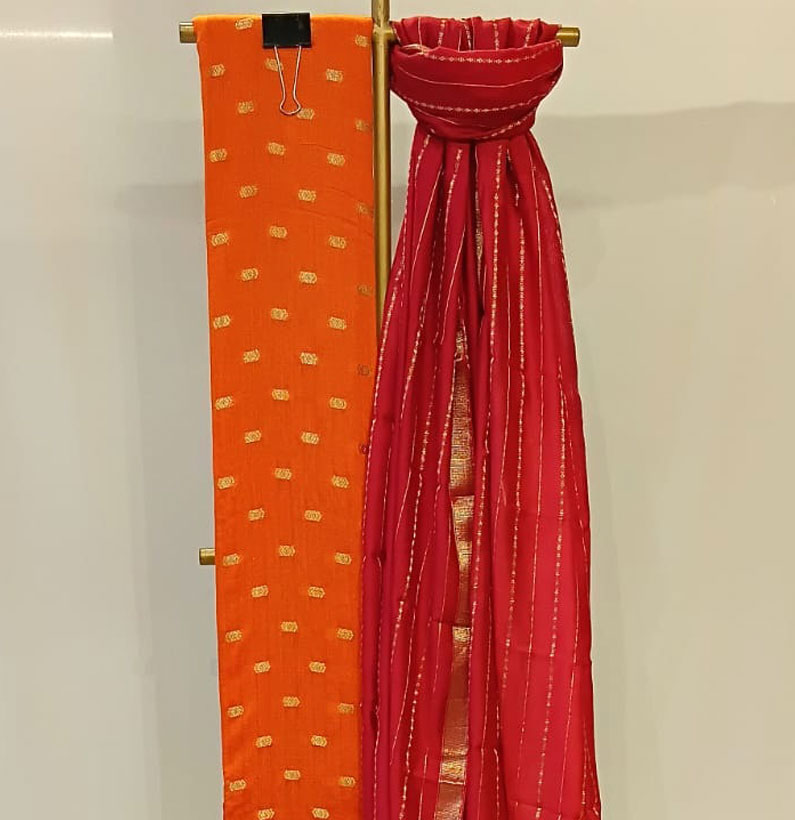 Be the first to review “Assam Silk Zari Booti Suit Orange/ Red”