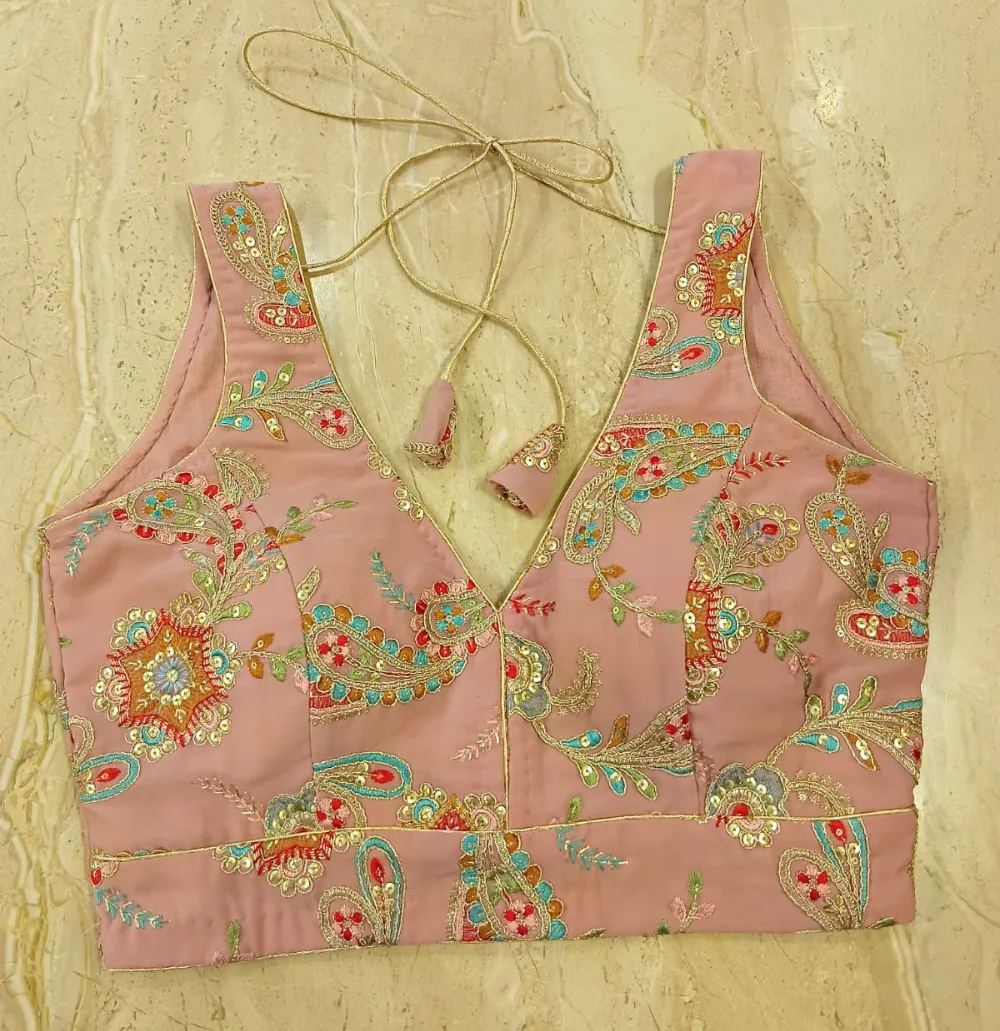 - This blouse features detailed embroidery in a lovely pyaji colour too.