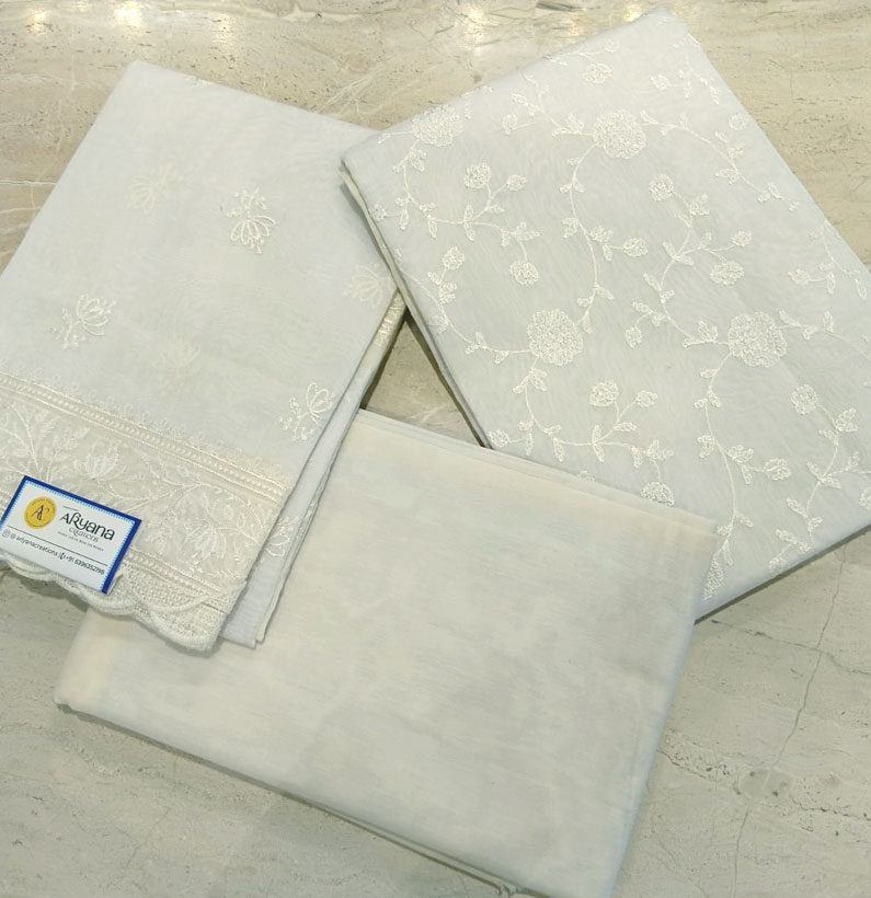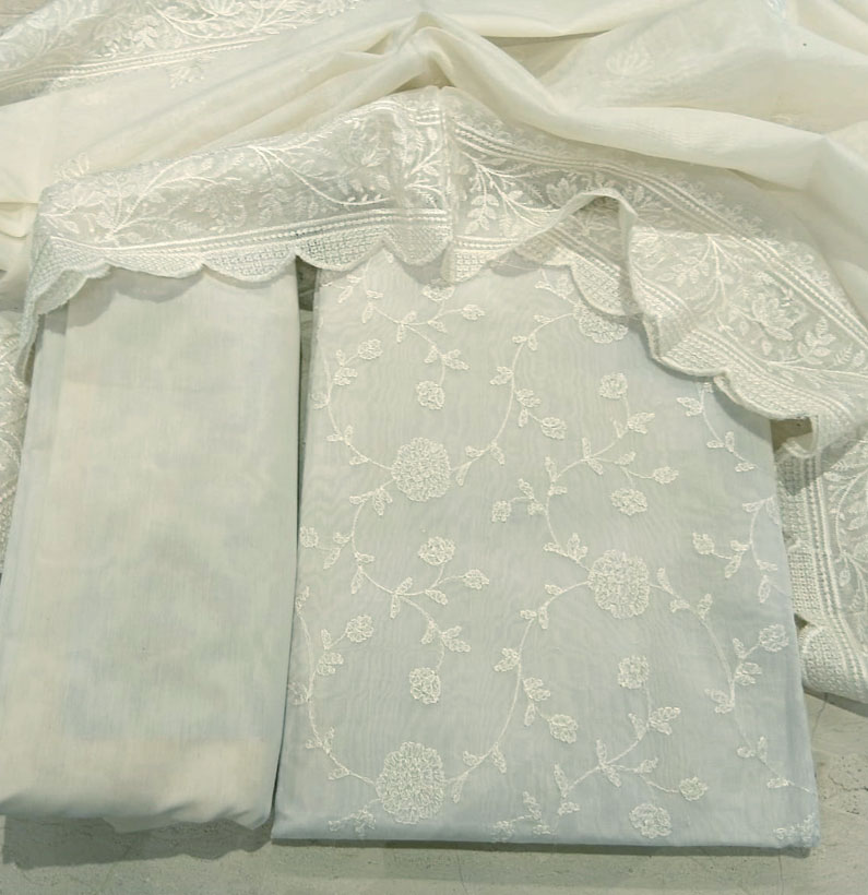 Home Suit Cotton Chanderi cotton 3 piece embroided suit off white