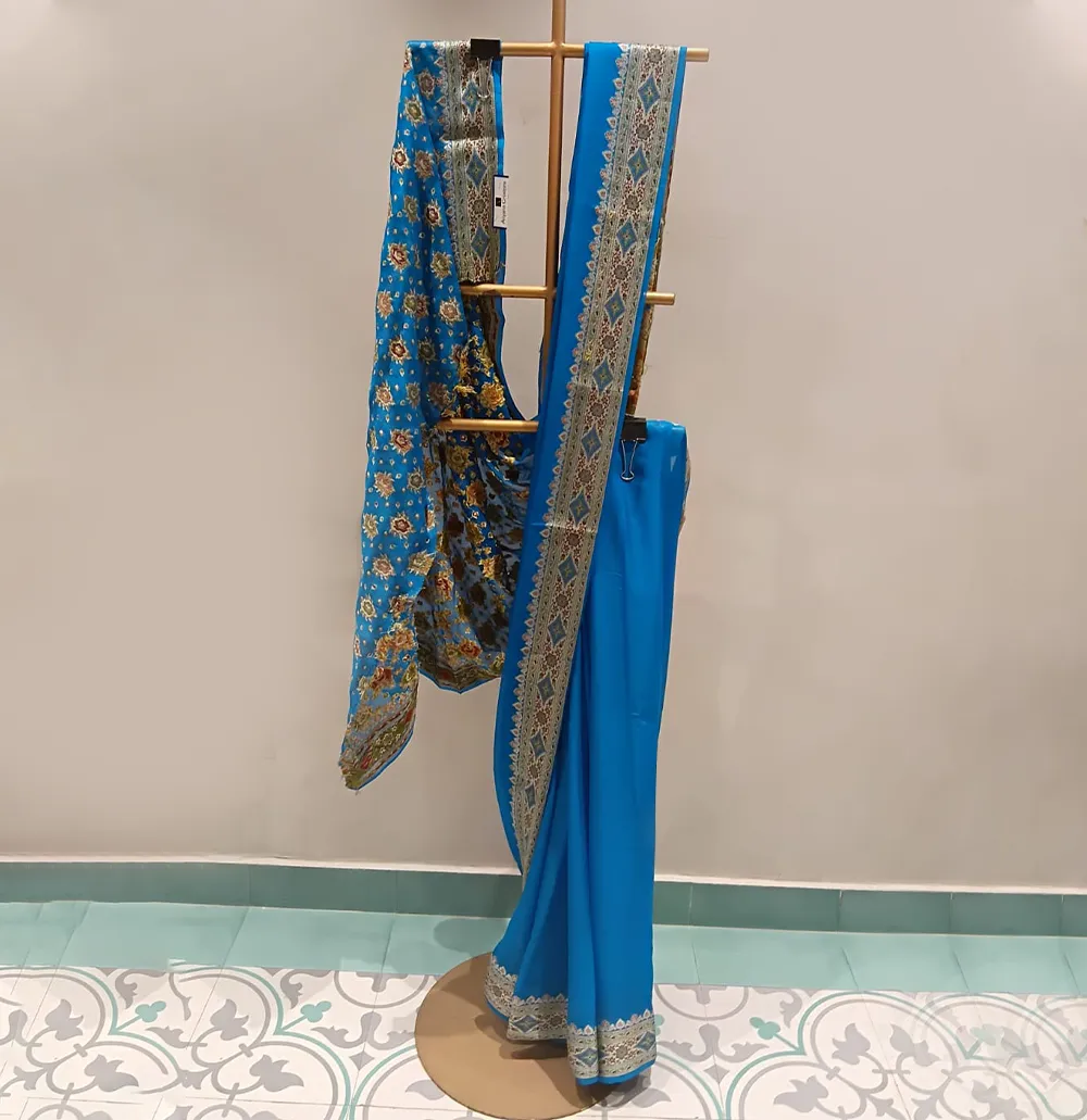 This simply plain chiffon saree is with a delicate Meena border, reflecting charm.