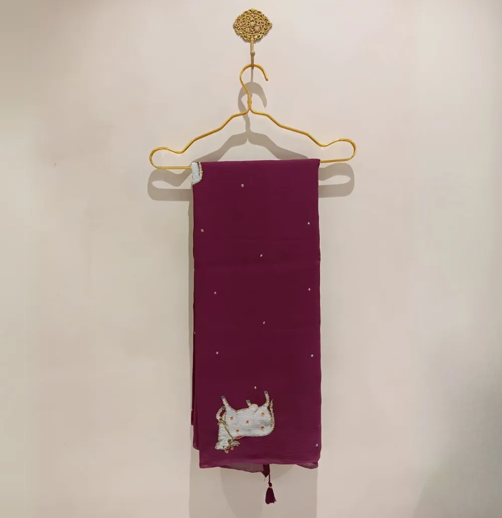 - Chiffon saree in rich wine, with beautiful embroidery too.