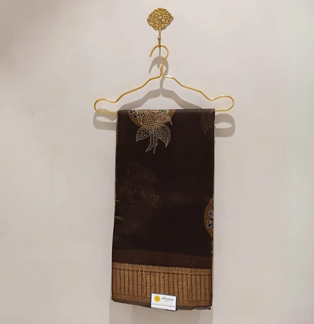 • A rich, deep brown cotton saree with subtle woven motifs and a classic striped border too.