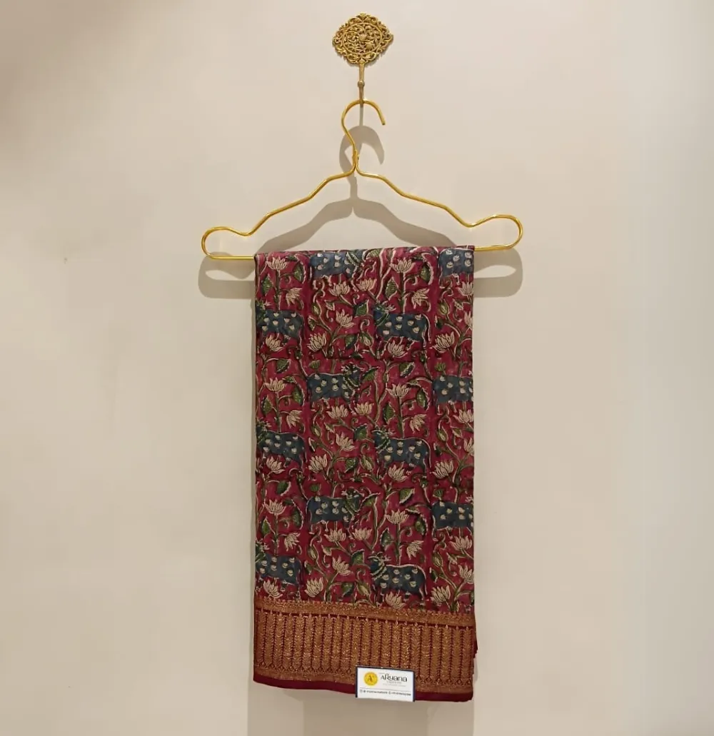 - This elegant cotton saree in a rich, warm shade of wine features intricate floral patterns too.