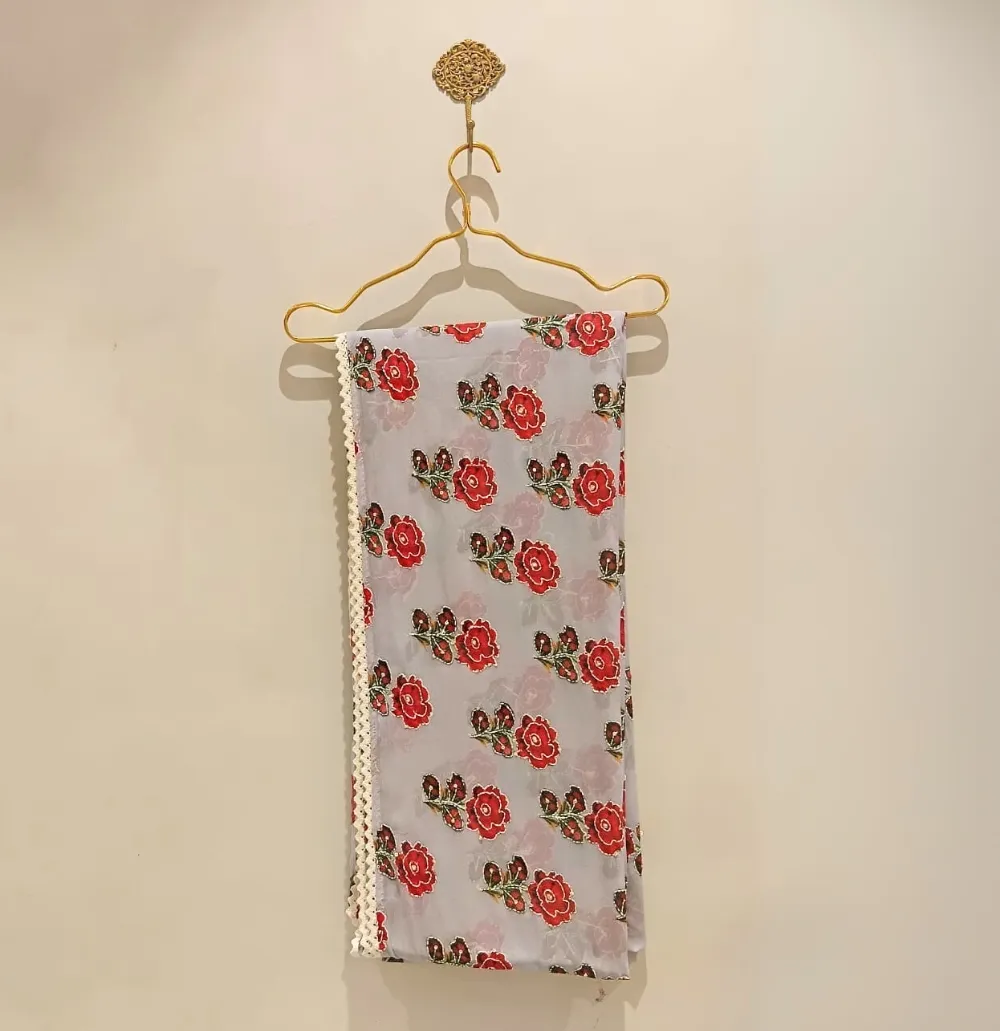 - It features charming katha work-inspired floral motifs in vibrant red, too.
