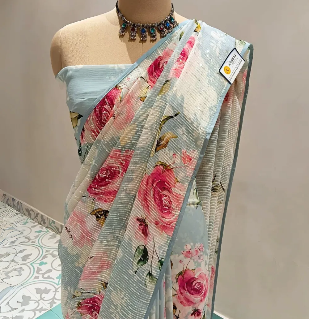 - Sea blue georgette saree with multi-sequin work—made to shine too.