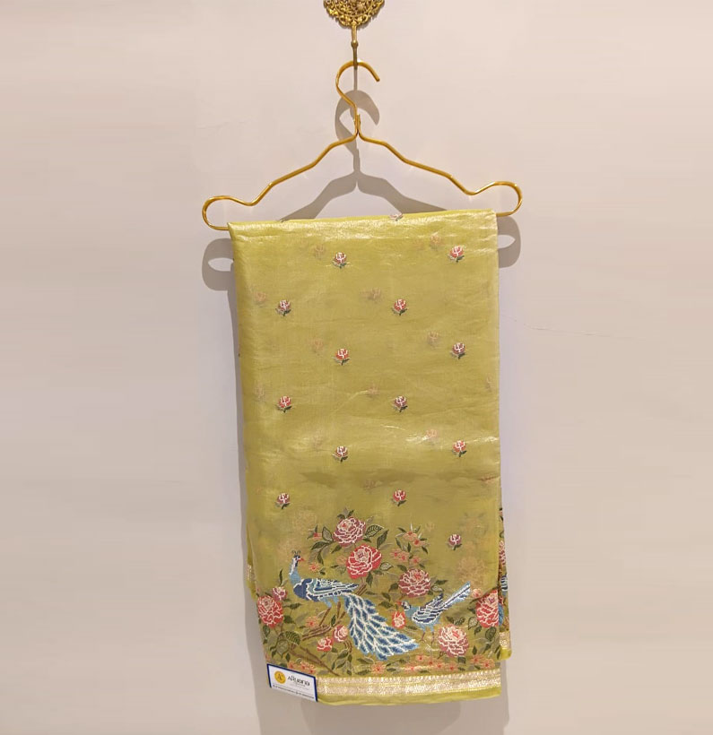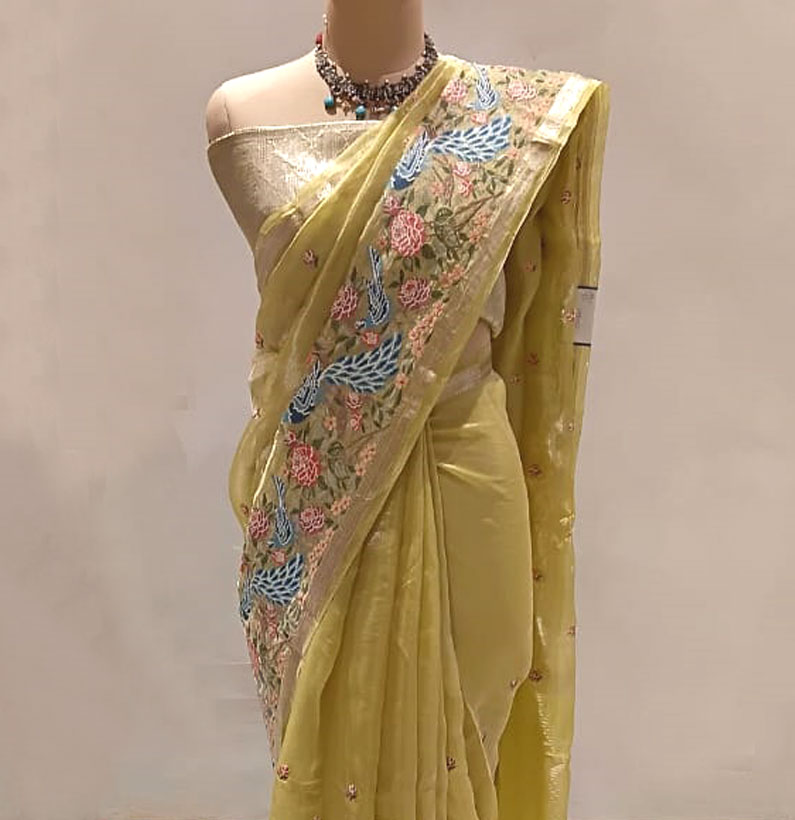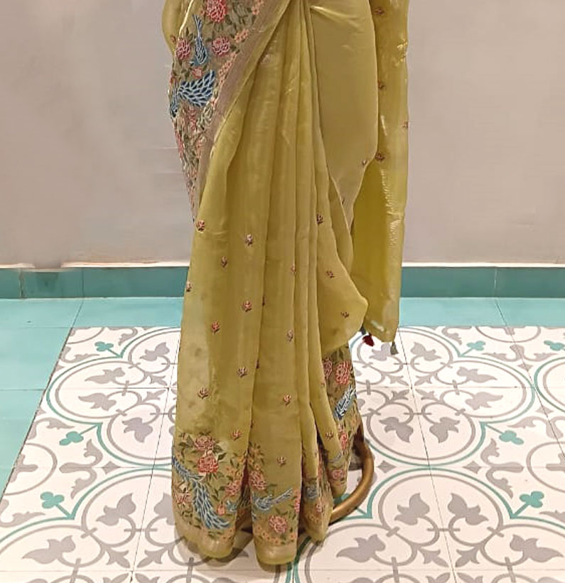 Kora embroided tissue saree pista green
