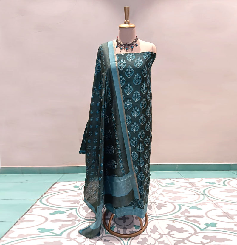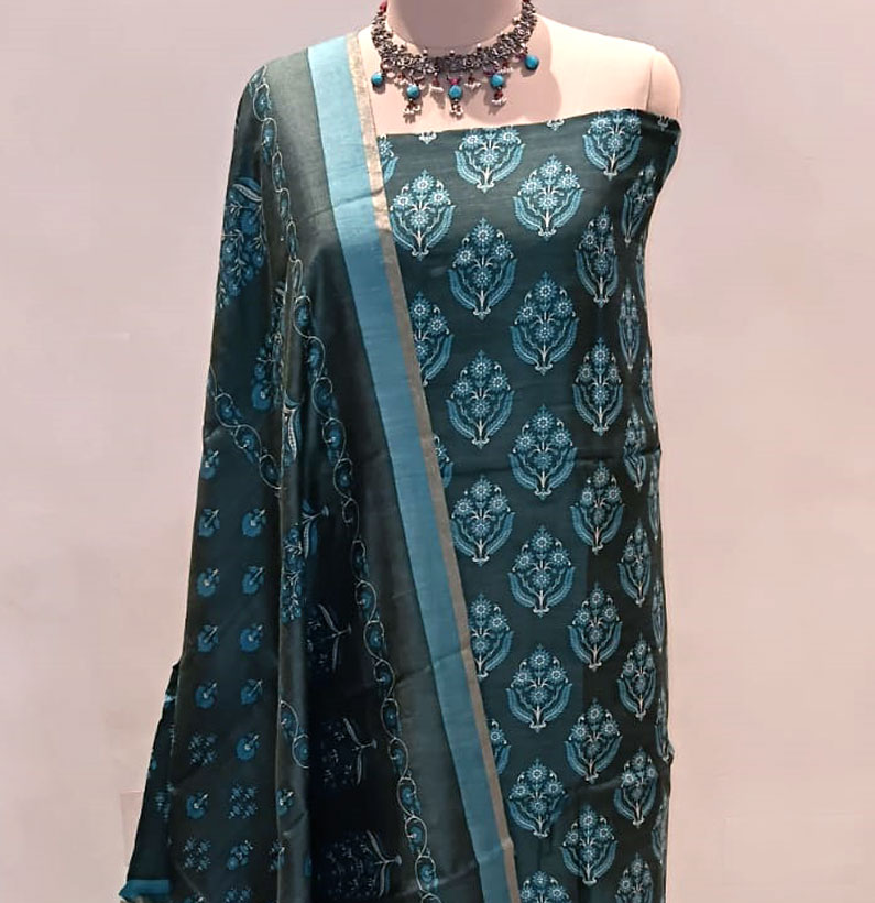 Home Suit Silk Moonga silk kantha border suit grey olive