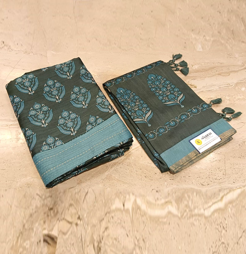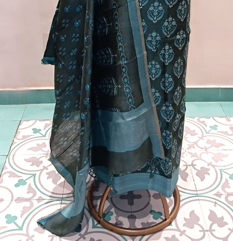 Be the first to review “Moonga silk kantha border suit grey olive” Cancel reply