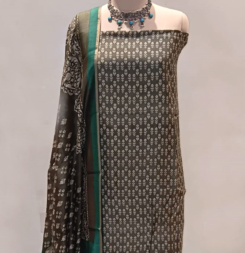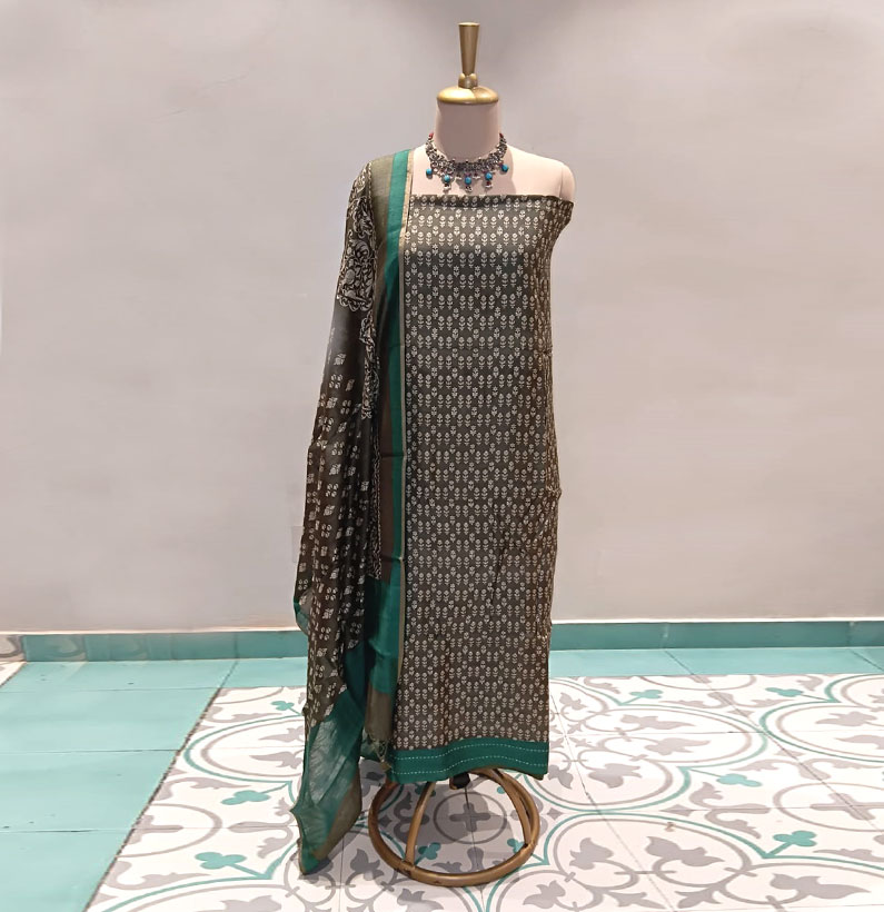 Home Suit Silk Moonga silk kantha border suit olive green