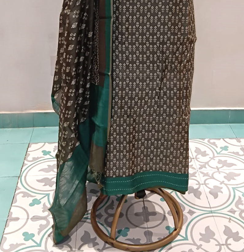 Be the first to review “Moonga silk kantha border suit olive green” Cancel reply