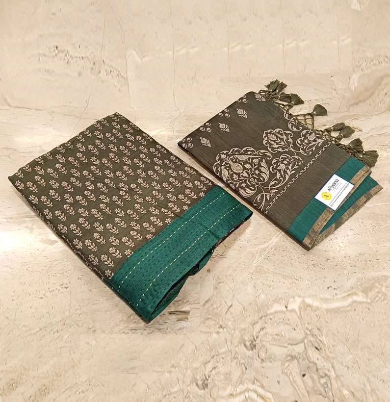 Moonga silk kantha border suit olive green