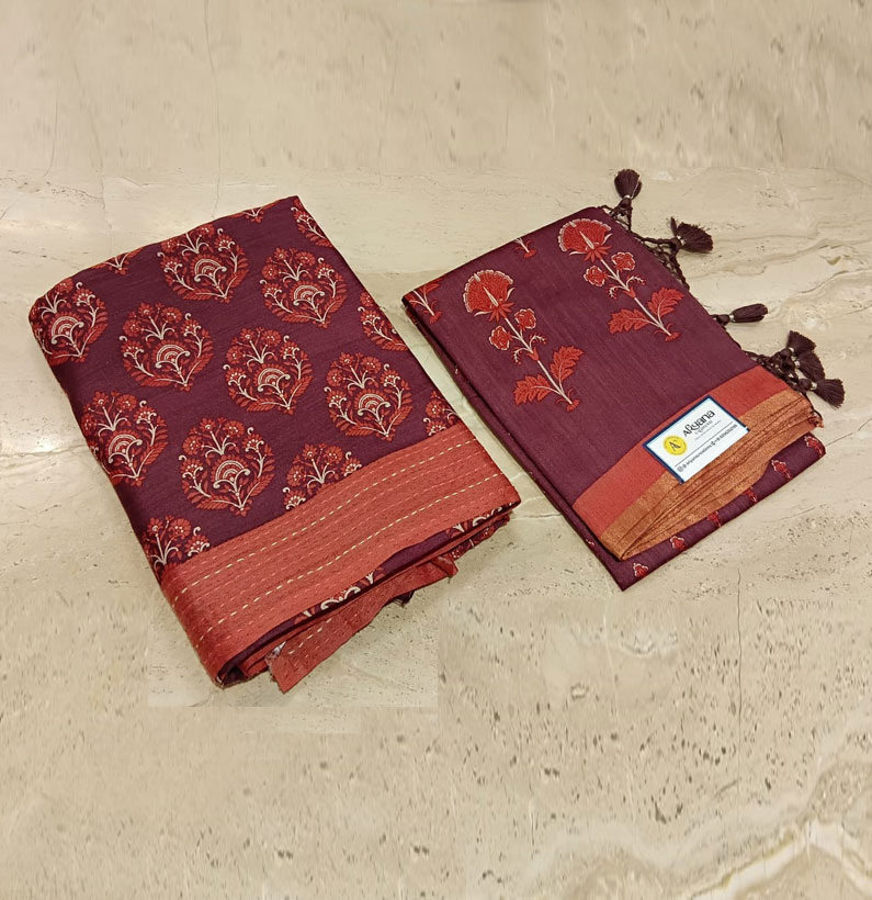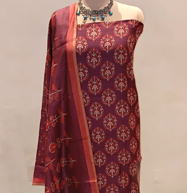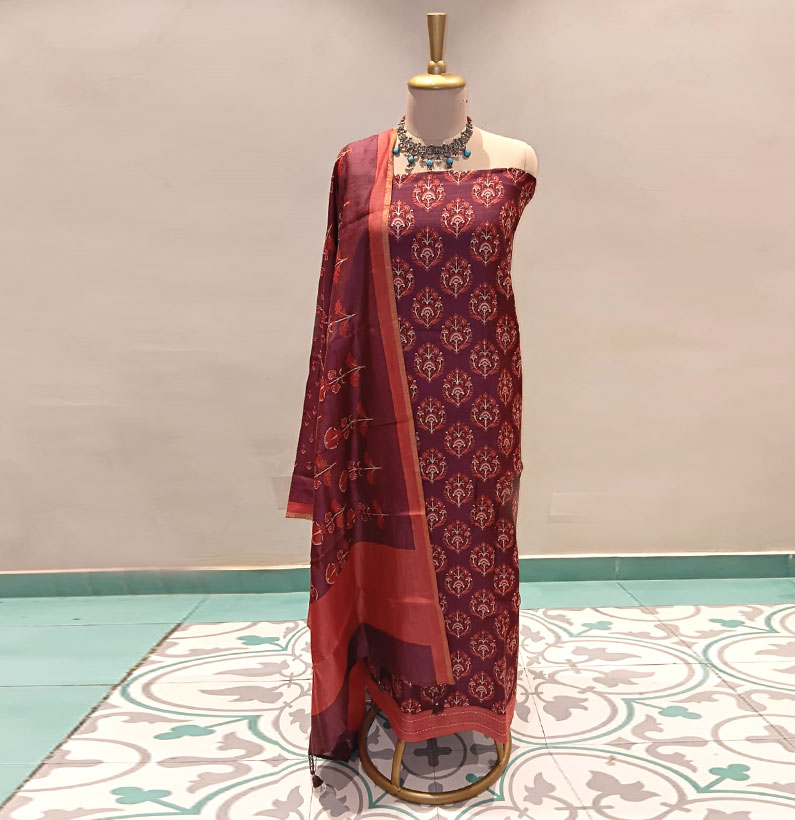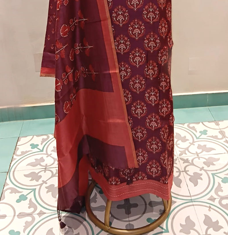 Home Suit Silk Moonga silk kantha border suit plum maroon