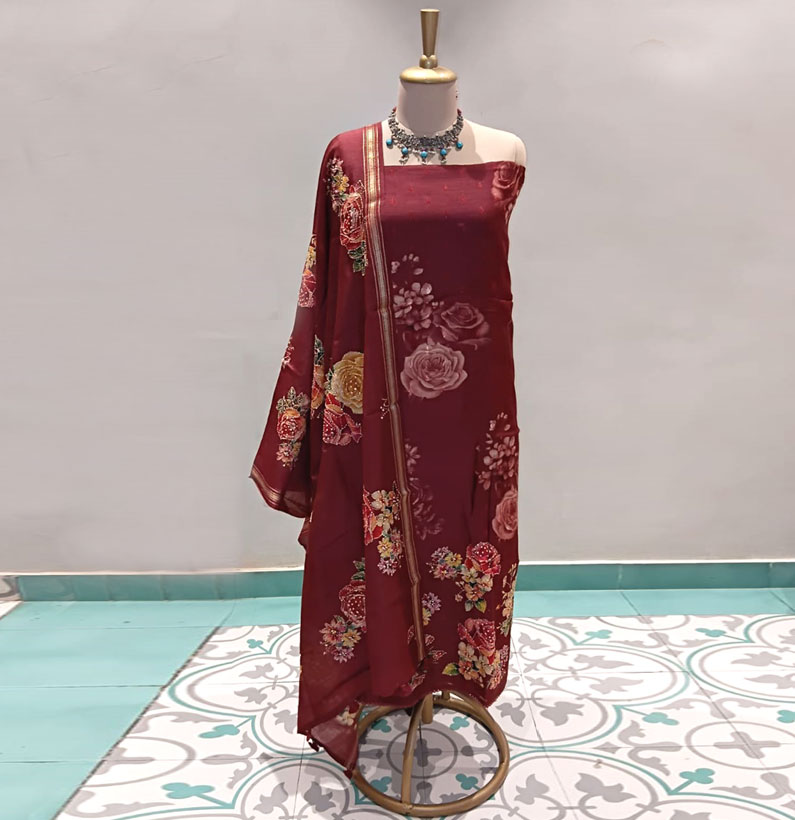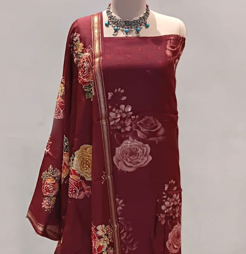 Home Suit Silk Moonga silk with kantha work maroonish red