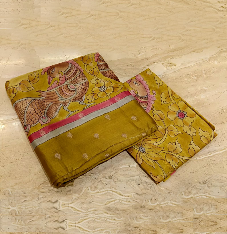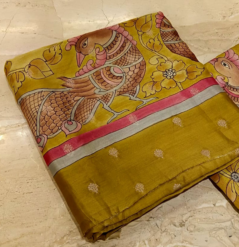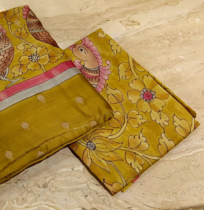 Mul Chanderi Kalamkari Zari Booti Suit M Green