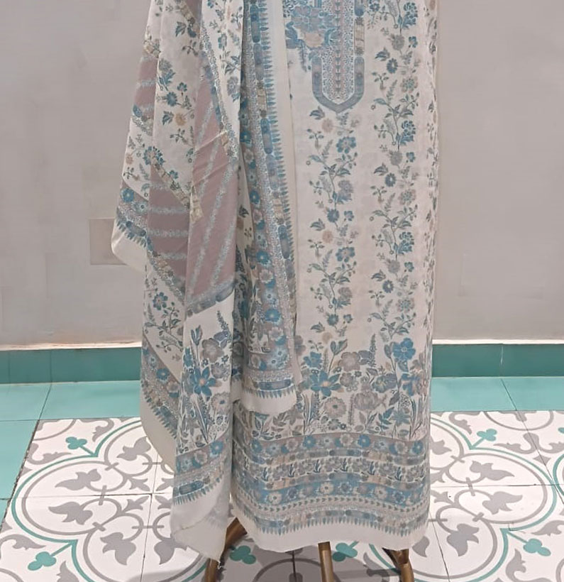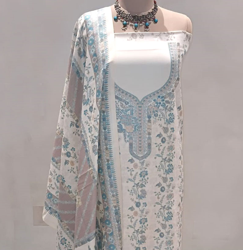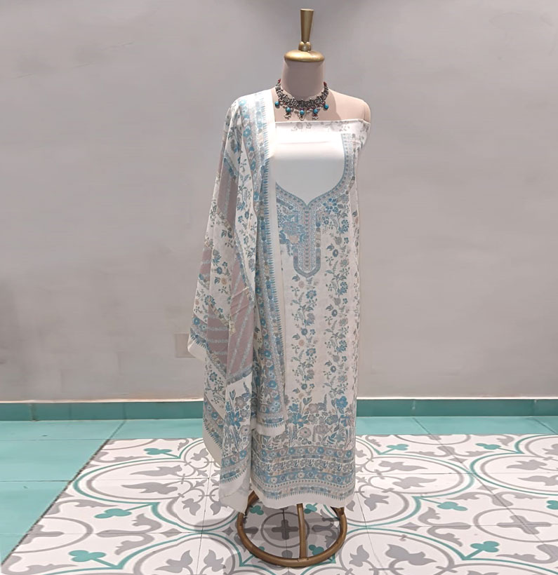 Home Suit Woolen Suit Printed woolen suit off whitE/firozi blue