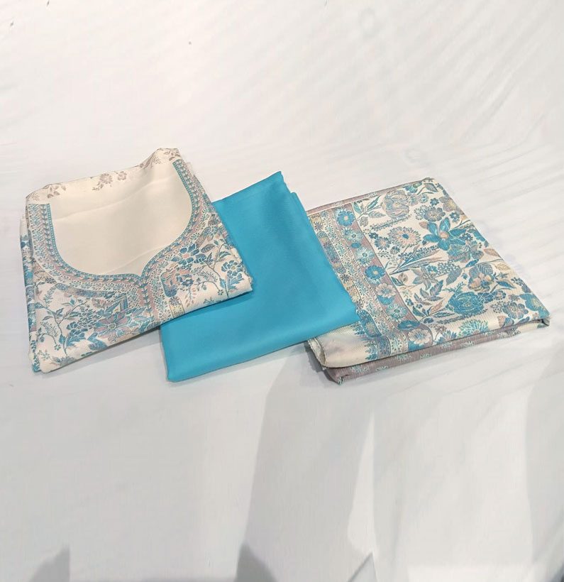 Be the first to review “Printed woolen suit off whitE/firozi blue”