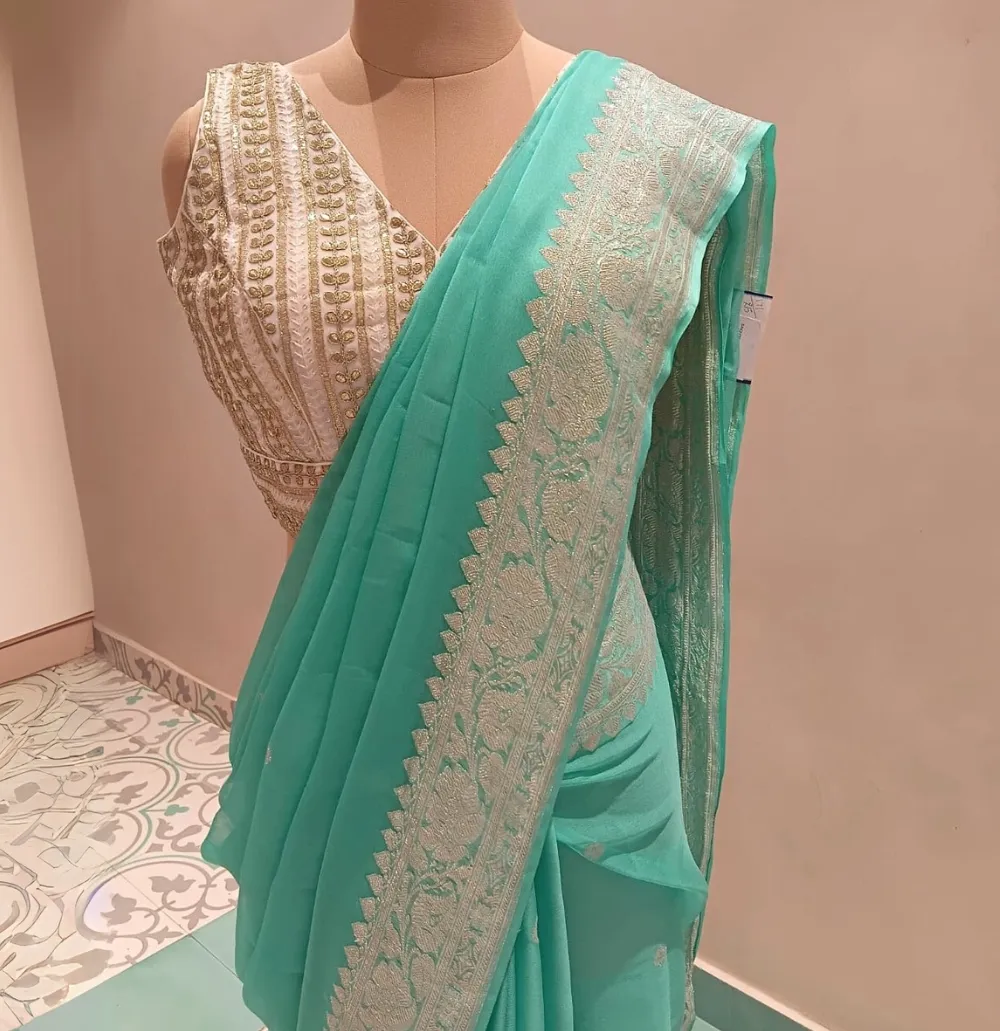 - Sea green chiffon highlighted by exquisite silver embroidery, too.