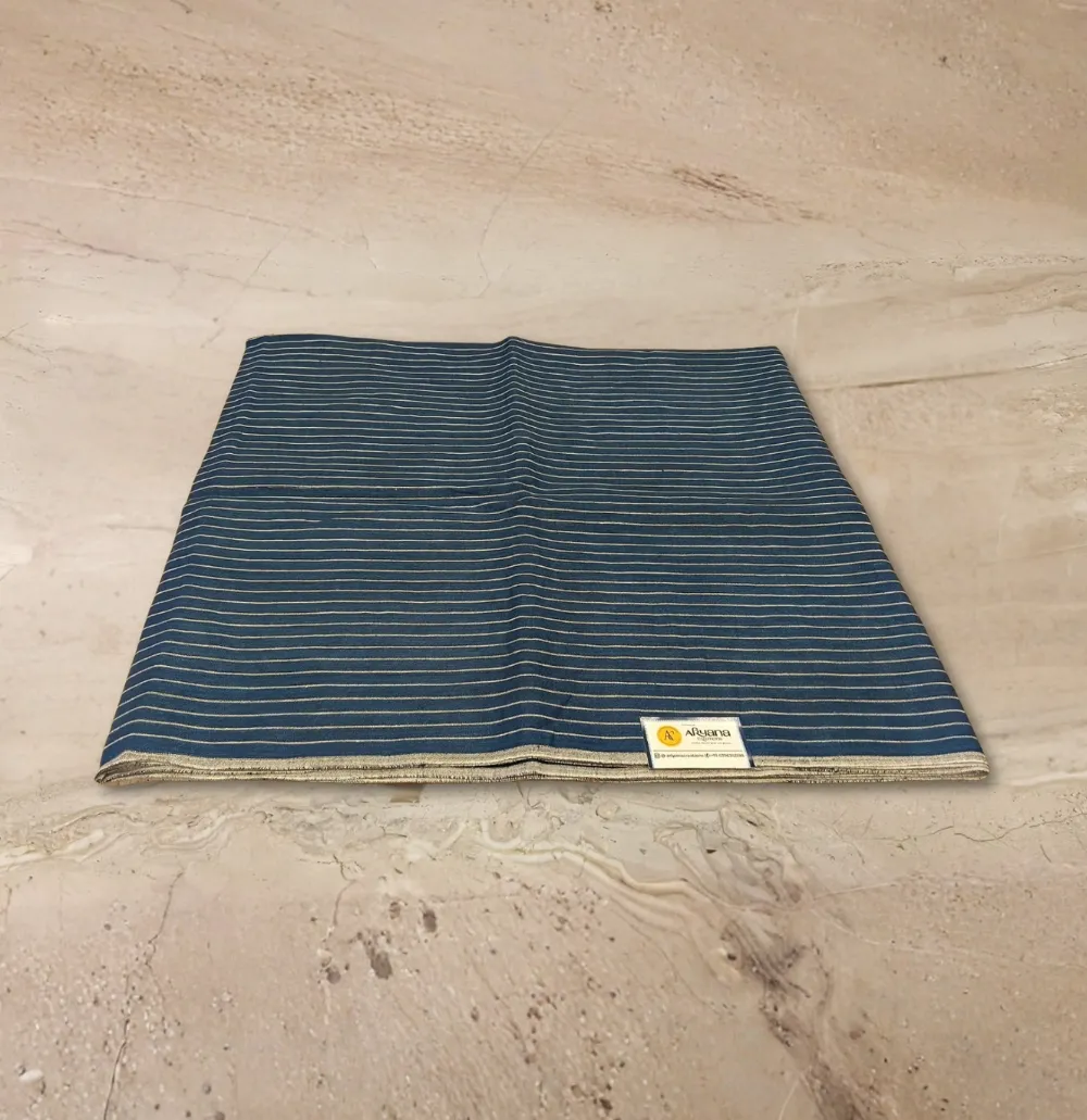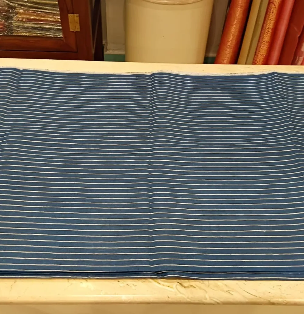 - Crafted from premium breathable linen, this striped blue fabric exudes refinement, too.