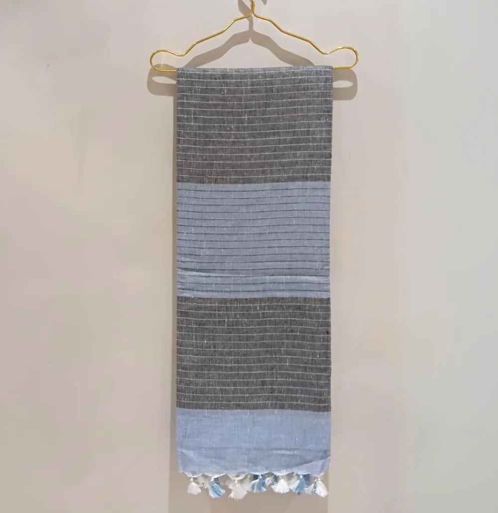 - Woven in pure linen, this saree comes in a serene sky-blue shade for an airy look too.
