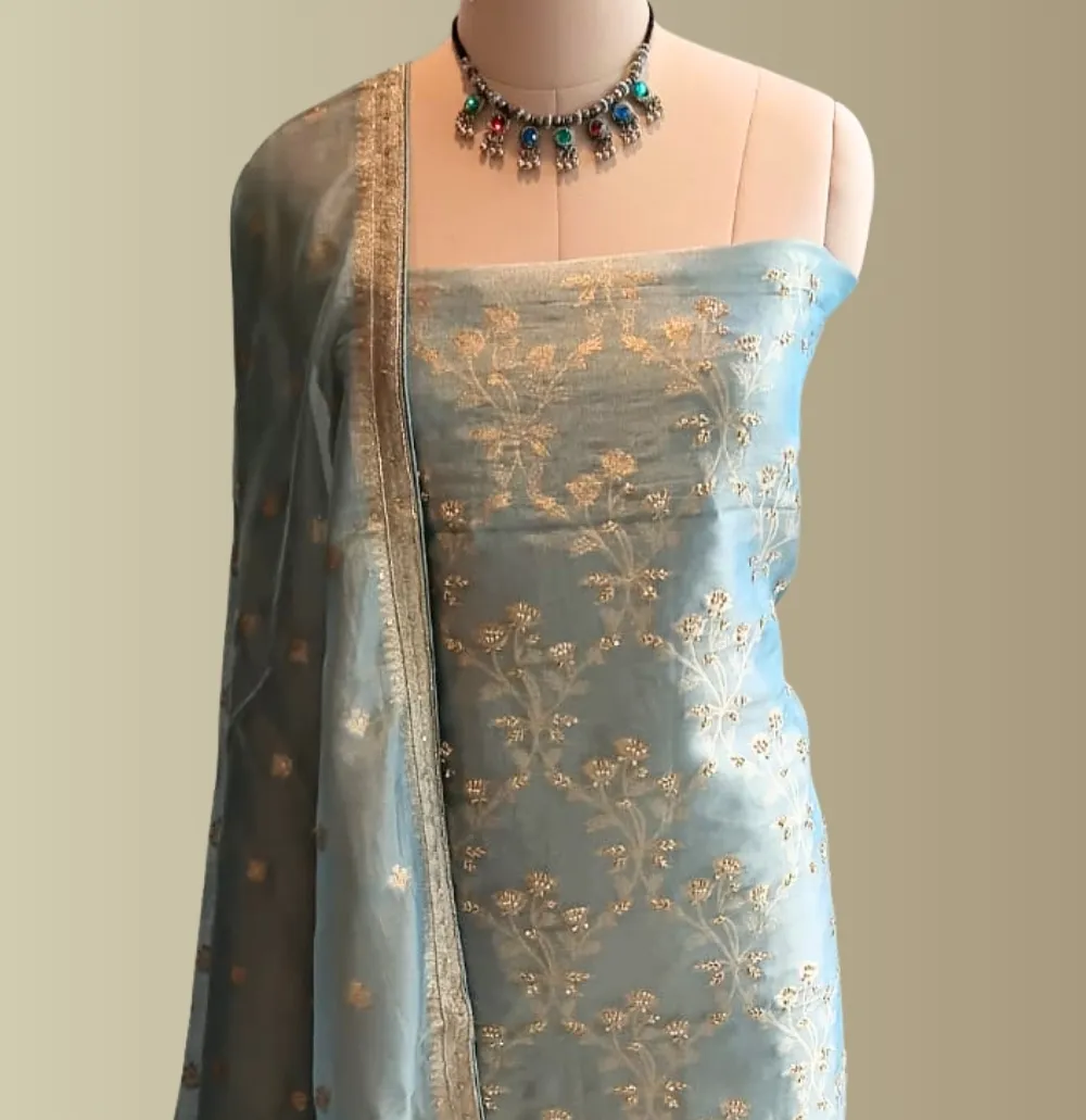 Be the first to review “Tissue Banarasi Embroidery Suit Zardozi Work Ice Blue” Cancel reply