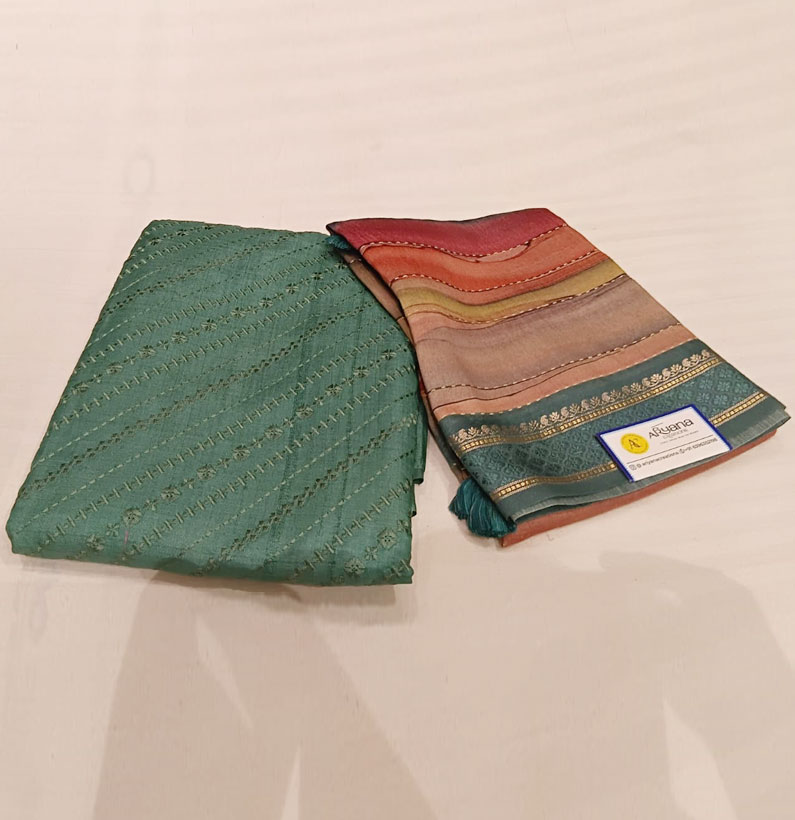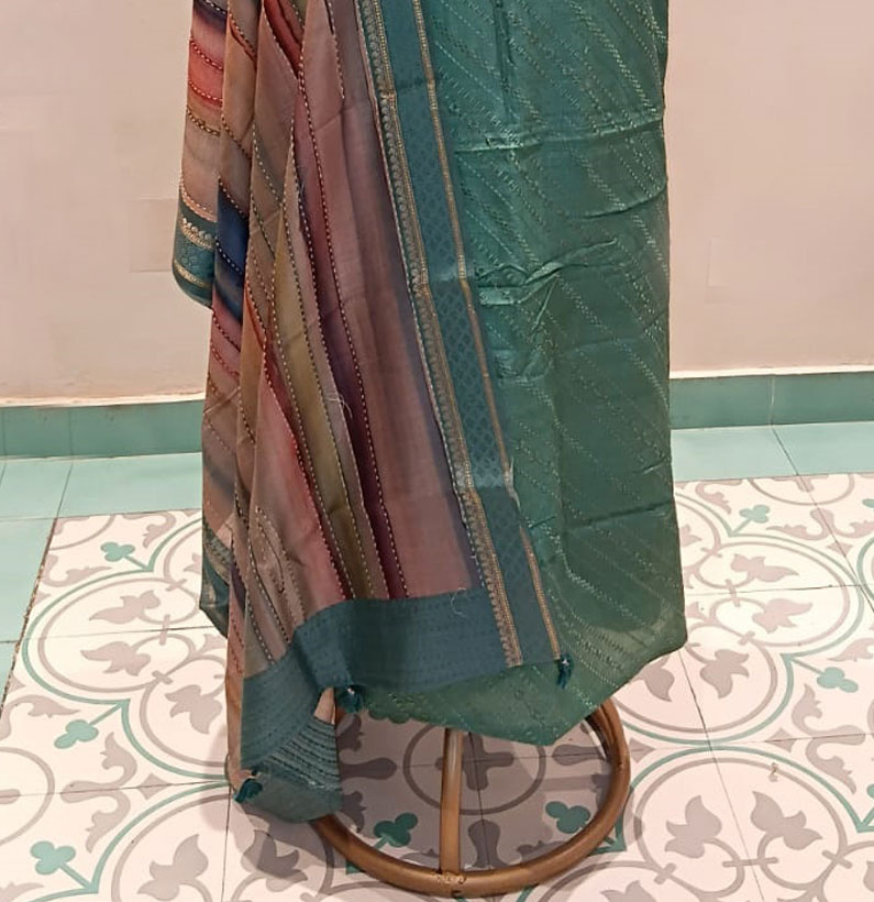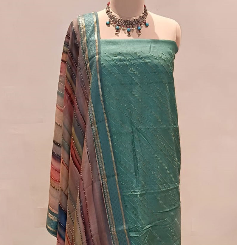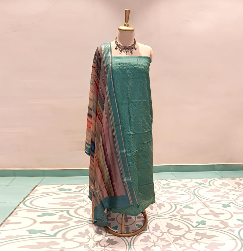 Home Suit Silk Tussar embroided suit striped dupatta sea green